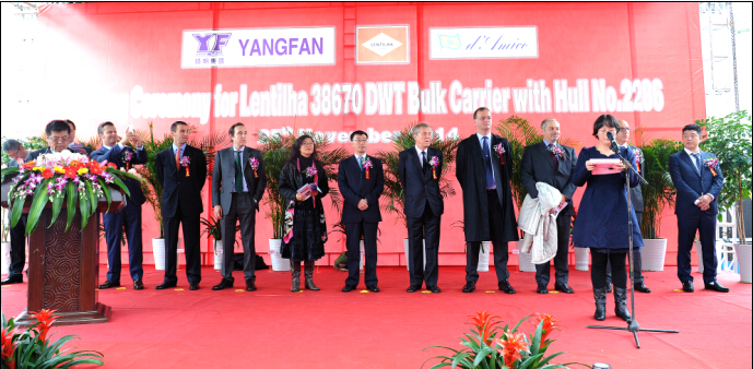 11月25日,由舟山船廠(chǎng)為L(cháng)entilha公司建造的38670DWT散貨船H2286舉行隆重的命名儀式。Dora投資有限公司董事長(cháng)Patrice de Carmaret先生、教母張麗佳女士、揚帆集團董事長(cháng)、總裁李明東等出席命名儀式。