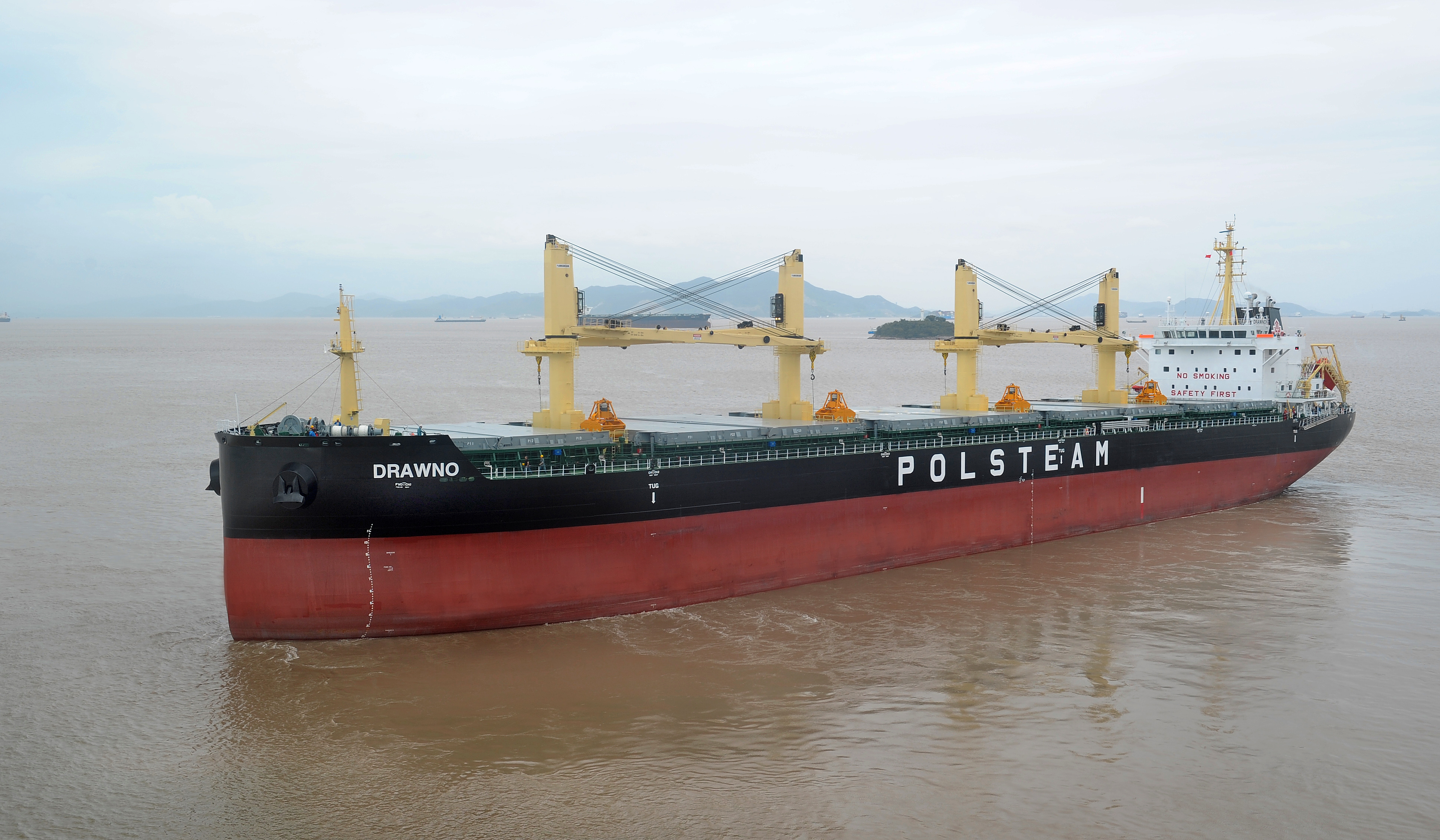 2018年9月7日,揚帆集團為波蘭船東建造的38520DWT系列散貨船“DRA WNO”正式簽字。該船型總長(cháng)179.99m,型寬30.00m,型深15.00m,保證航速13.59kn,保證燃油消耗160.3gkwh。該船型是揚帆集團自行設計的經(jīng)濟節能、綠色環(huán)保型散貨船,大開(kāi)口的雙殼設計,尾部左舷裝有一個(gè)鰭,船舵上帶舵球,起到降能增效作用。