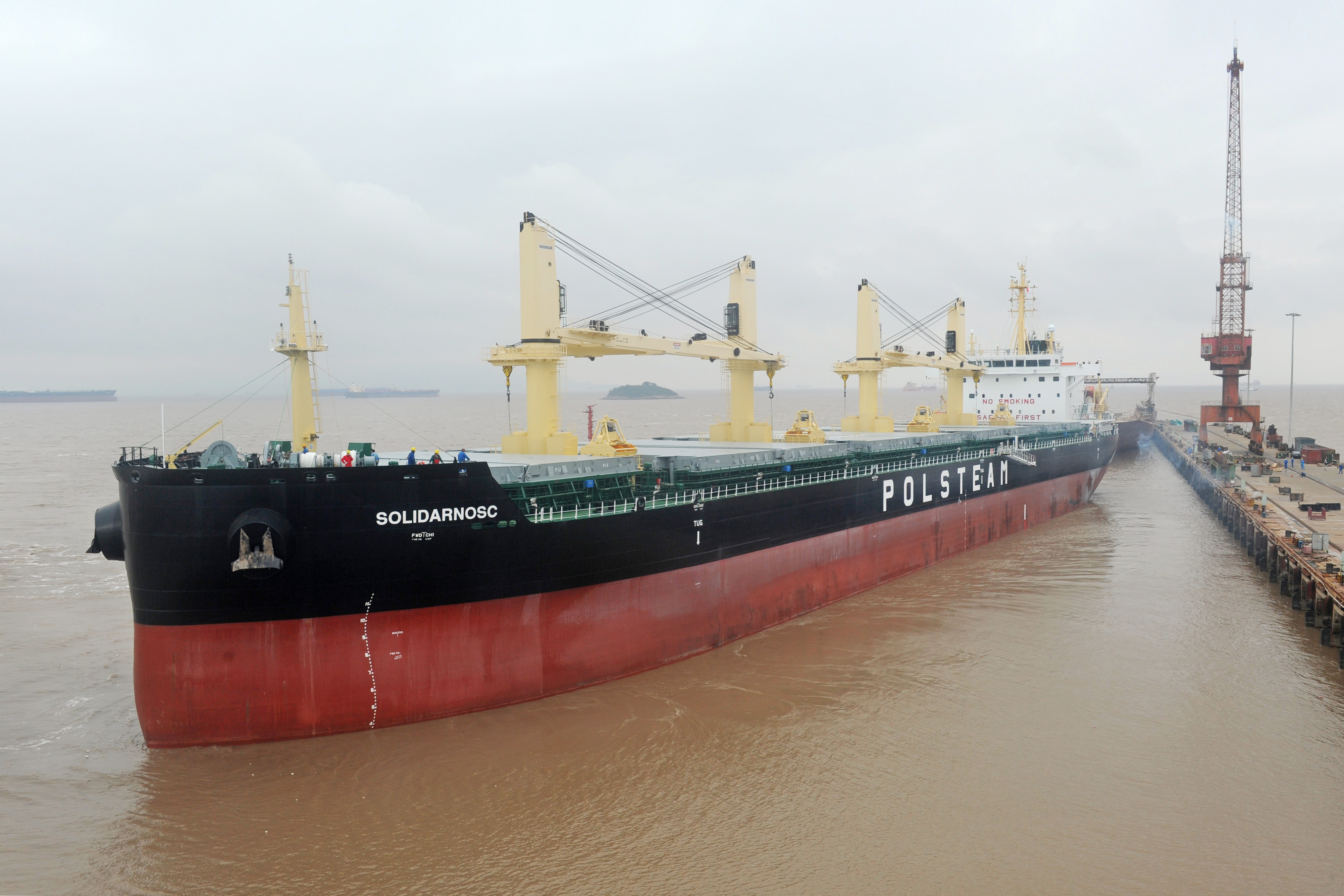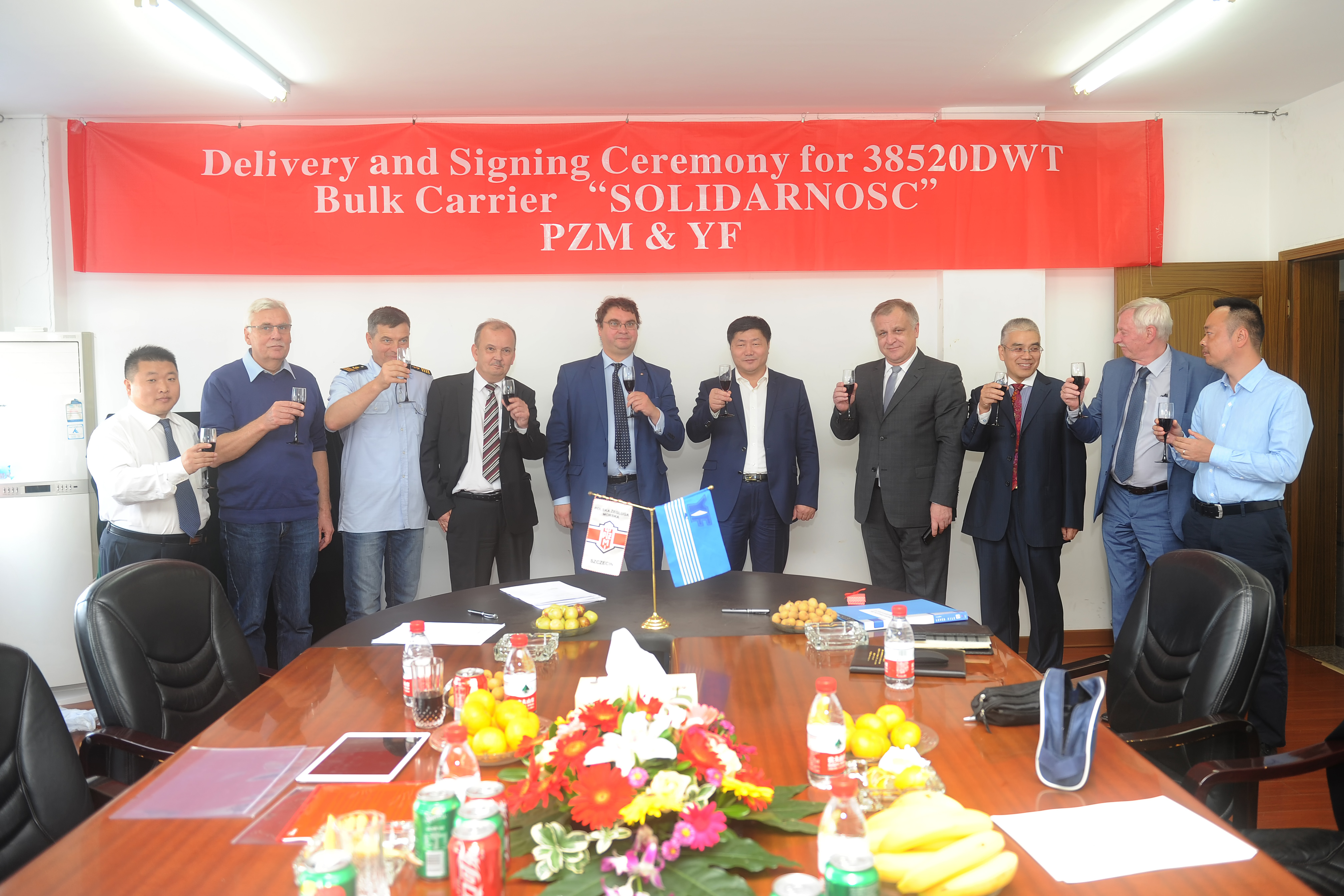 2018年10月11日,揚帆集團為波蘭船東建造的38520DWT系列散貨船“SOLID ARNOSC”正式簽字交付。該船型總長(cháng)179.99m,型寬30.00m,型深15.00m,保證航速13.59kn,保證燃油消耗160.3gkwh。該船型是揚帆集團自行設計的經(jīng)濟節能、綠色環(huán)保型散貨船,大開(kāi)口的雙殼設計,尾部左舷裝有一個(gè)鰭,船舵上帶舵球,起到降能增效作用。