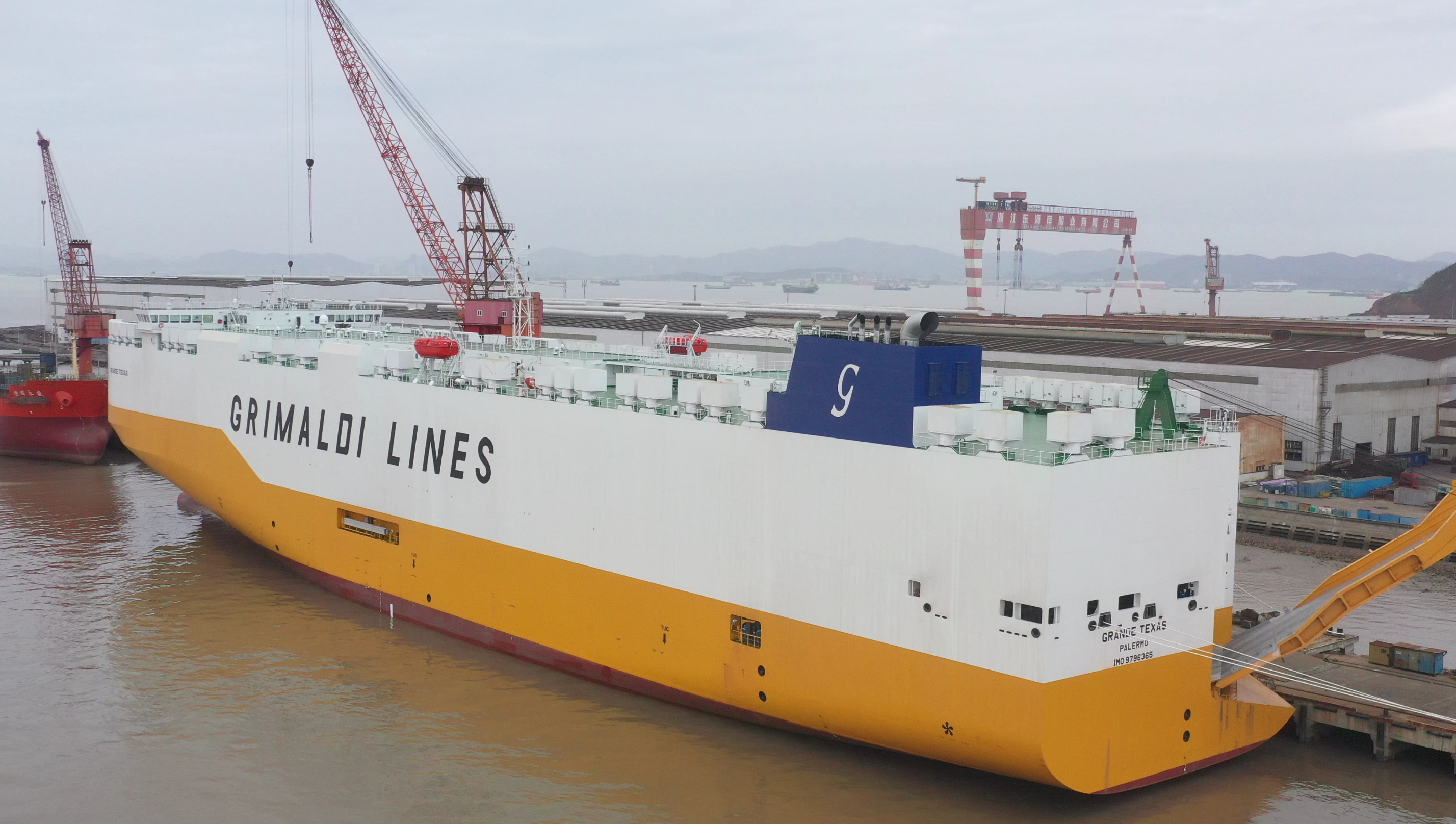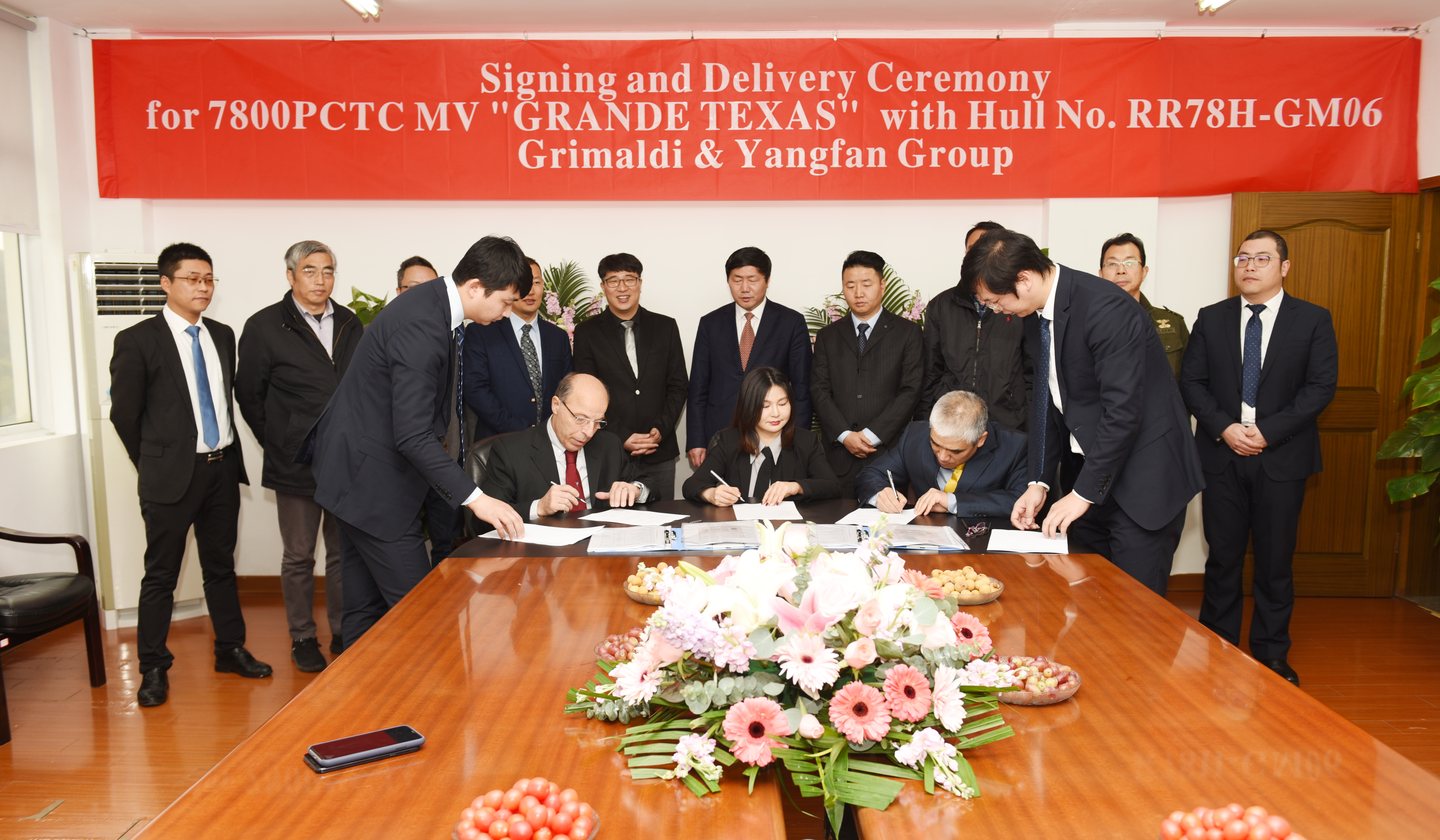 2021年1月26日,由揚帆集團股份有限公司下屬全資子公司——浙江東海岸船業(yè)有限公司為意大利船東Grimaldi集團公司承建的7800車(chē)位汽車(chē)滾裝船(PCTC)系列船“GRANDE TEXAS"”(船號GM06)正式簽字交付。