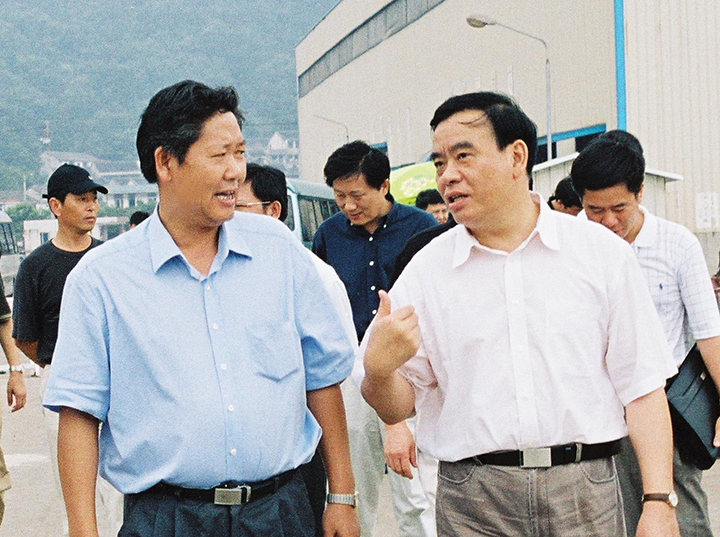 2003年8月8日,浙江省委副書(shū)記、省長(cháng)呂祖善(右一)來(lái)“揚帆”視察,要求揚帆集團依托舟山的港口和區位優(yōu)勢,拓展發(fā)展思路,創(chuàng )新管理機制,抓住船舶工業(yè)發(fā)展的有利機遇,進(jìn)一步做大做強。